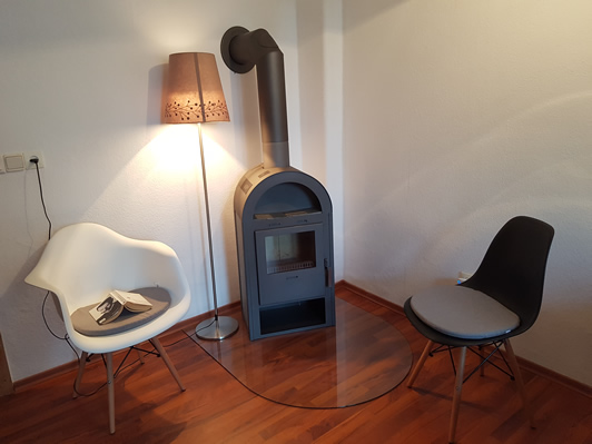 • Wohnzimmer mit Schlafsofa (1,60×2,00m), Hifi +TV Ecke, Bücherregal für groß und klein, Kamin mit Brennholz,