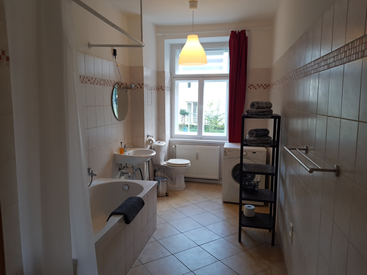 • Bad mit Fenster, Badewanne mit Duschmgl., Waschmaschine, Fön, Bügeleisen